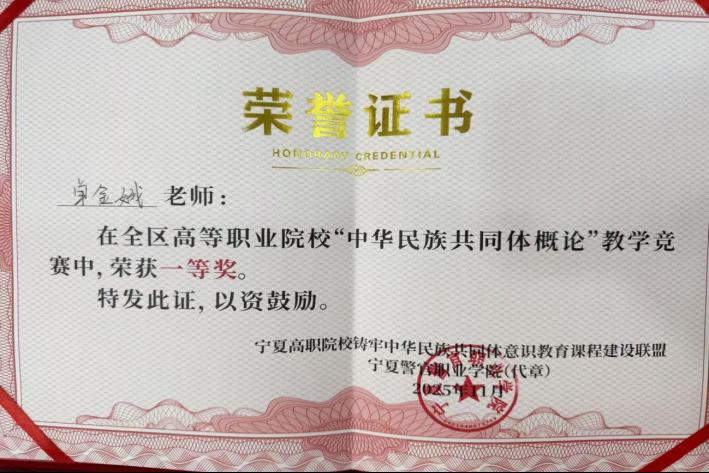 11月26日,全区高职院校《中华民族共同体概论》课程教学竞赛暨教学展示活动在宁夏警官职业学院圆满落幕。竞赛中,来自全区各高职院校的11名参赛教师围绕课程核心知识点,结合教学实践与地域特色,展现了丰富多样的教学方法与鲜明的教学风格。马克思主义教学科研部青年教师单金娥凭借扎实的教学功底、创新的教学设计与深刻的思想内涵,在激烈角逐中脱颖而出,成功荣获一等奖。